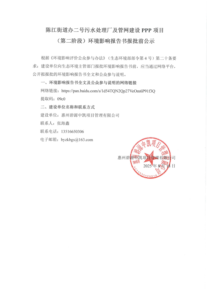 陳江街道辦二號污水處理廠(chǎng)及管網(wǎng)建設PPP項目(第二階段)環(huán)境影響報告書(shū)報批前公示