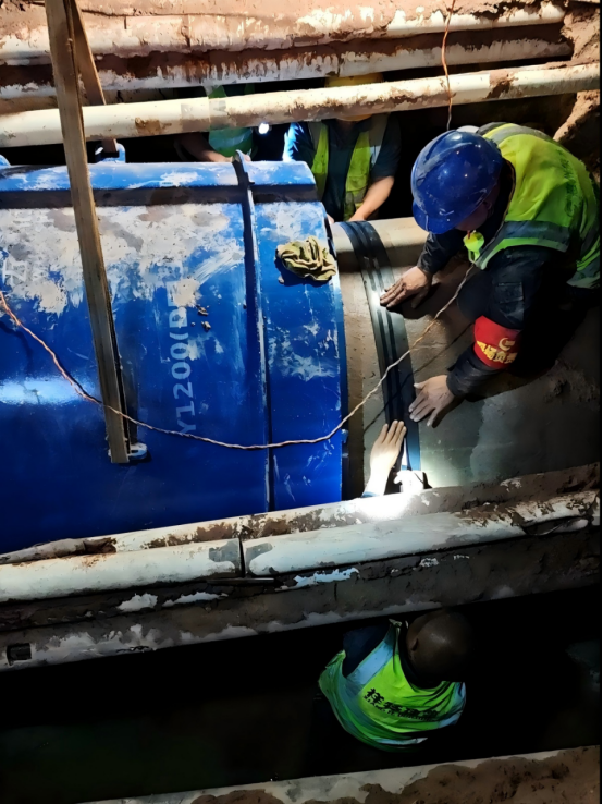 開(kāi)挖現場(chǎng)變成了一個(gè)燈火通明的“地下手術(shù)室”。鉆孔機靜立一旁,搶修隊員們依靠人力,像考古學(xué)家般小心翼翼地在管線(xiàn)夾層中清理出作業(yè)面。泥水混雜,空間逼仄,抽水泵在一旁不知疲倦地轟鳴,將不斷滲出的積水及時(shí)排走。每一次鐵鏟的起落,隊員們都格外專(zhuān)注。 泥漿與地下滲水濕透了工裝,但所有人的注意力都高度集中于一點(diǎn):將那副特制的、重達數百公斤的“搶修夾”精準吊裝到位。它如同一個(gè)巨大的“血管夾”,在漏點(diǎn)處被穩穩合攏、緊固,憑借強大的密封力瞬間止住漏水。整個(gè)過(guò)程,管道壓力平穩,未影響區域正常供水。